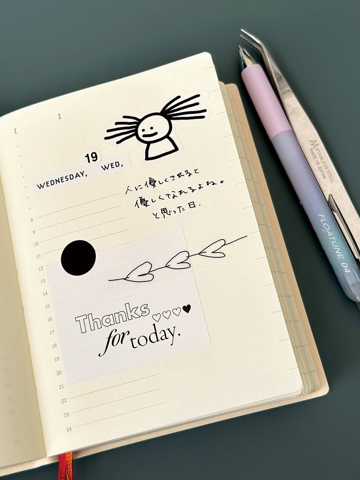手帳やコラージュにそっと添えるだけで、ページの雰囲気に軽やかなアクセントを与えてくれるデザインです。シールは半透明でツヤを抑えたマット仕様なので、紙にもふんわり馴染みます。